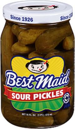 Best Maid Whole Sour Pickles. Personalized health review for Best Maid PicklesDill. Plump cucumbers water vinegar salt and natural flavorings all combine to make the fantastic dill brine for Best Maid Dill Pickles.
